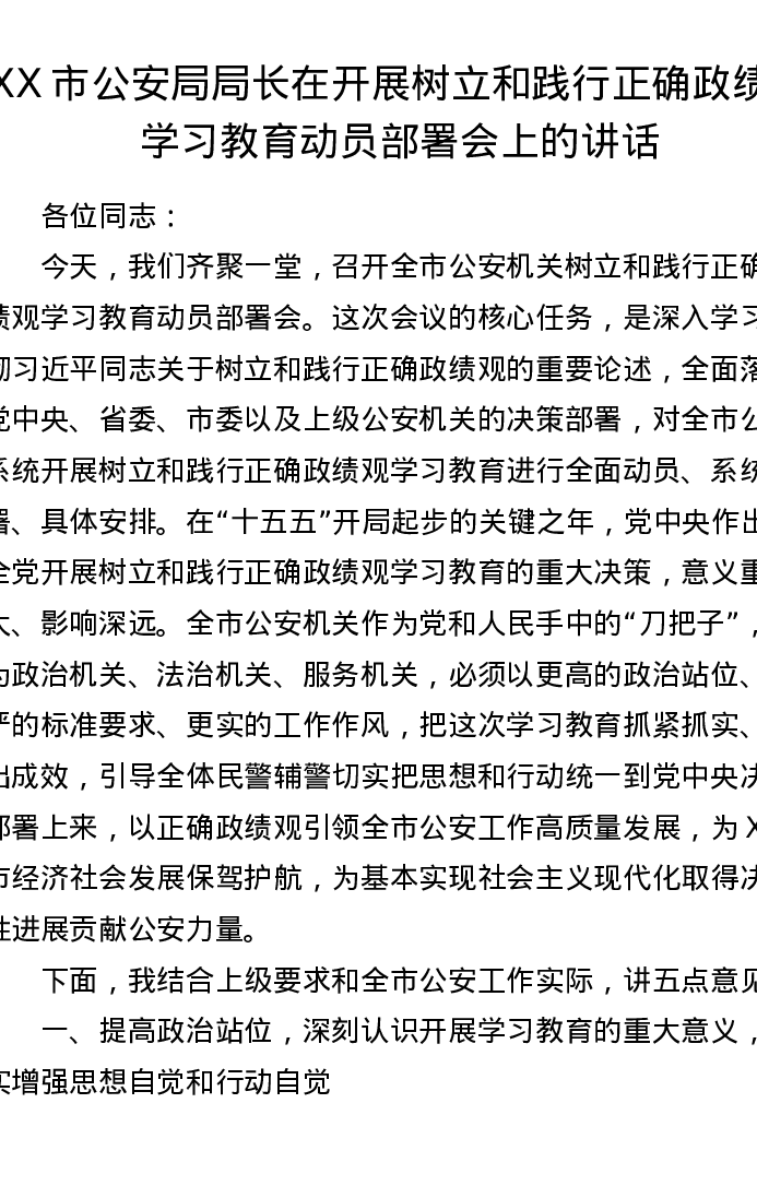 XX市公安局局长在开展树立和践行正确ZJG学习教育动员部署会上的讲话3