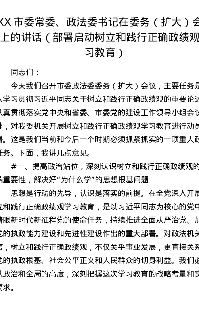 XX市委常委、政法委书记在委务(扩大)会议上的讲话(部署启动树立和践行正确ZJG学习教育)(5298字)