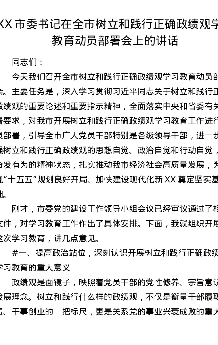 XX市委书记在全市树立和践行正确ZJG学习教育动员部署会上的讲话(5885字)