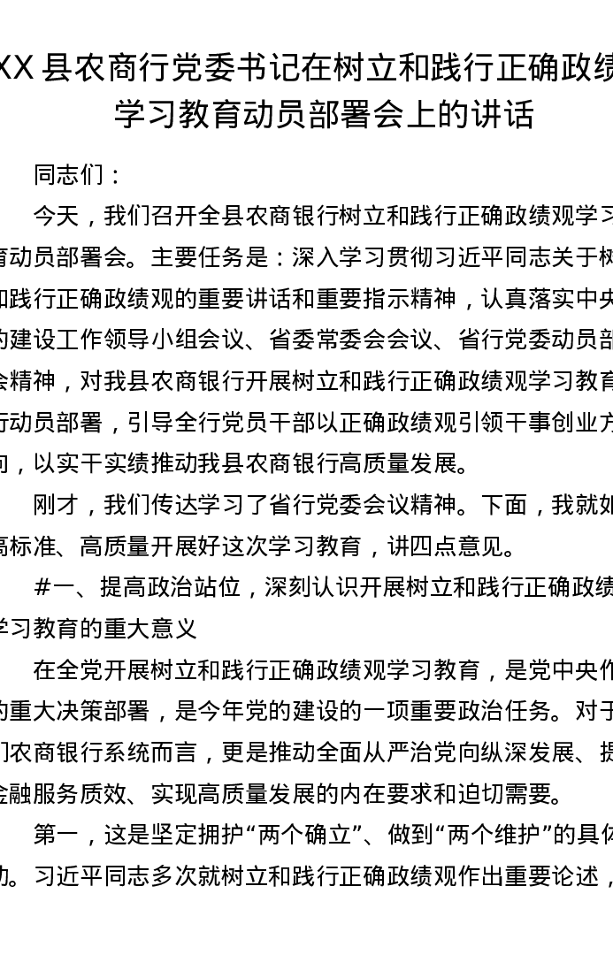 XX县农商行党委书记在树立和践行正确ZJG学习教育动员部署会上的讲话(4514字)
