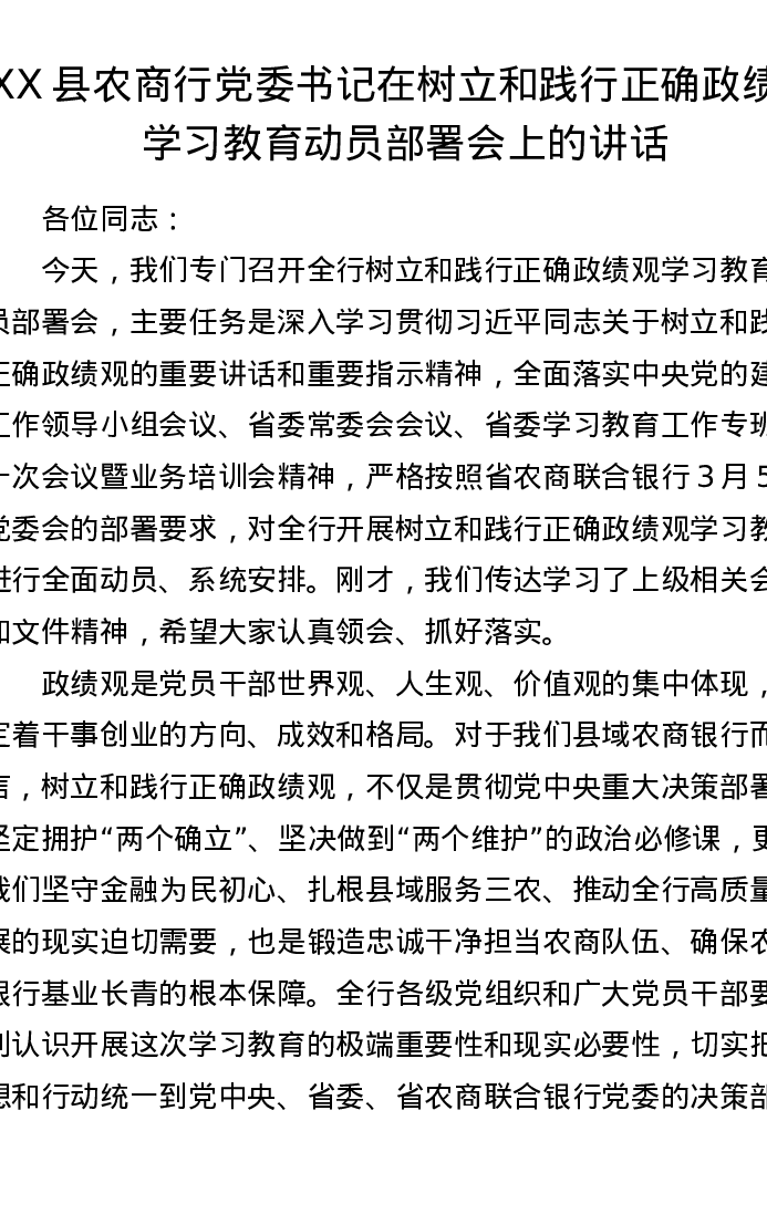 XX县农商行党委书记在树立和践行正确ZJG学习教育动员部署会上的讲话(9945字)