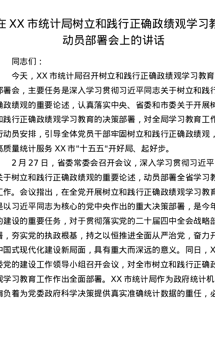 在XX市统计局树立和践行正确ZJG学习教育动员部署会上的讲话