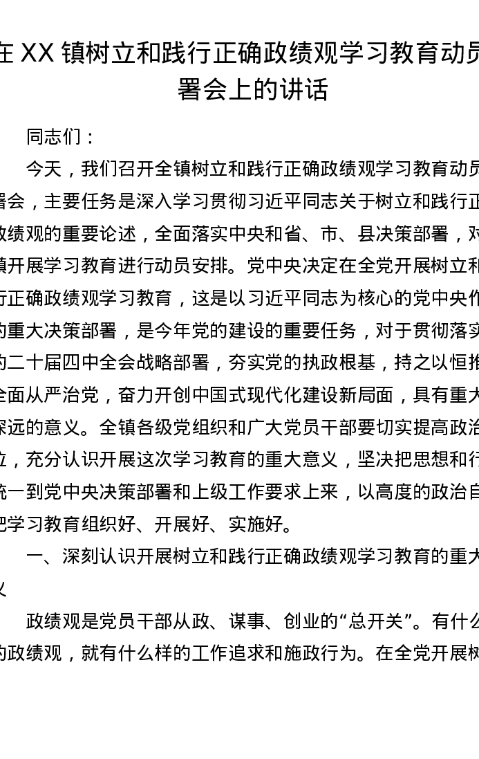 在XX镇树立和践行正确ZJG学习教育动员部署会上的讲话