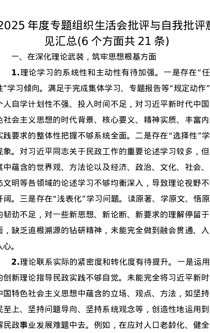 2025年度专题组织xxx批评与自我批评意见汇总(6个方面共21条)
