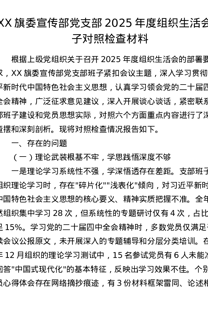 XX旗委宣传部党支部2025年度组织xxx班子对照检查材料