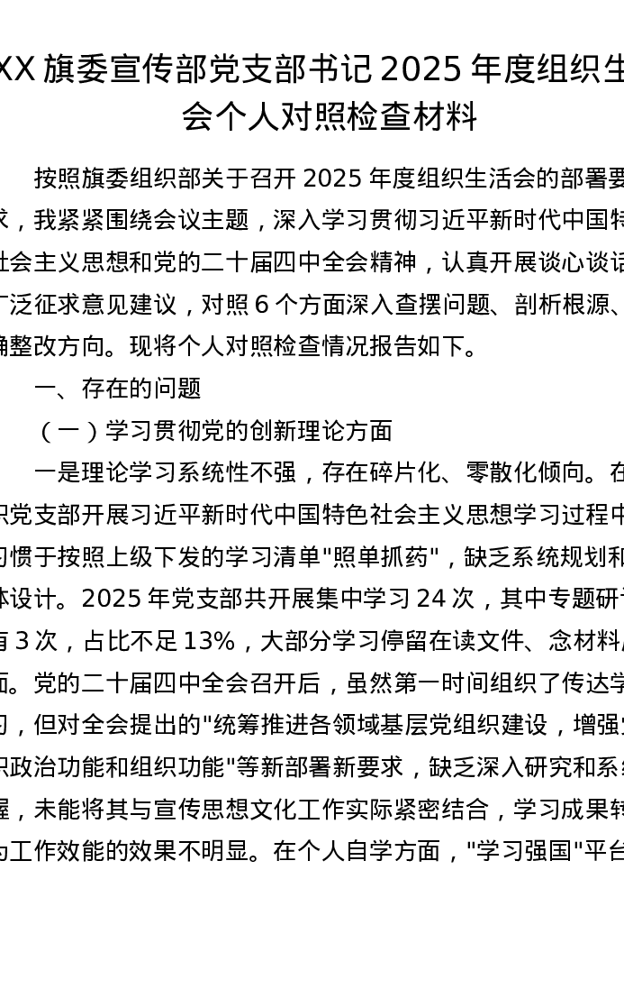 XX旗委宣传部党支部书记2025年度组织xxx个人对照检查材料