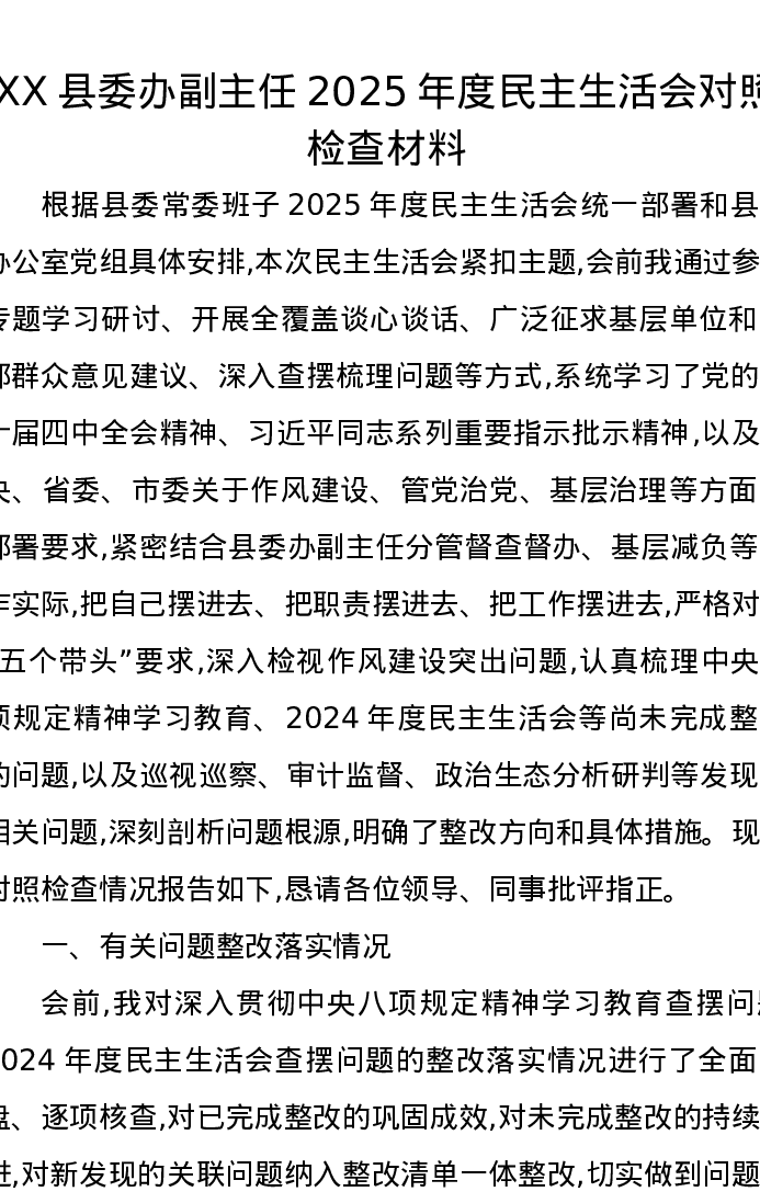 XX县委办副主任2025年度xxxxx对照检查材料