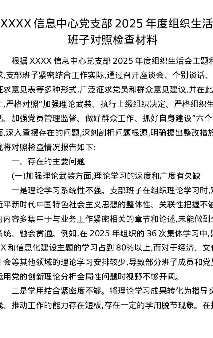 XX信息中心党支部2025年度组织xxx班子对照检查材料