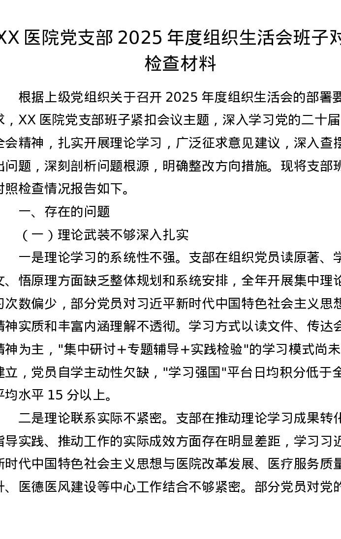 XX医院党支部2025年度组织xxx班子对照检查材料