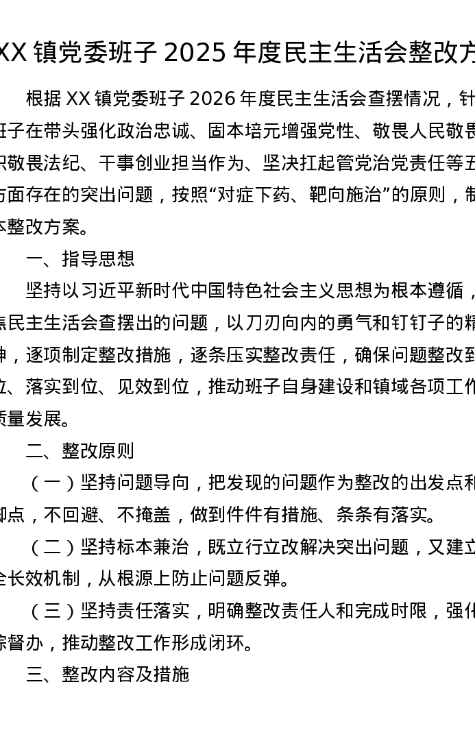 XX镇党委班子2025年度xxxxx整改方案