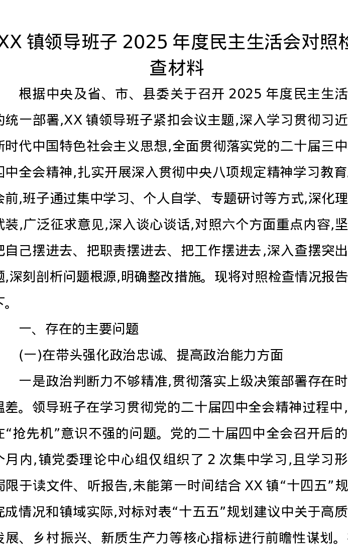 XX镇领导班子2025年度xxxxx对照检查材料
