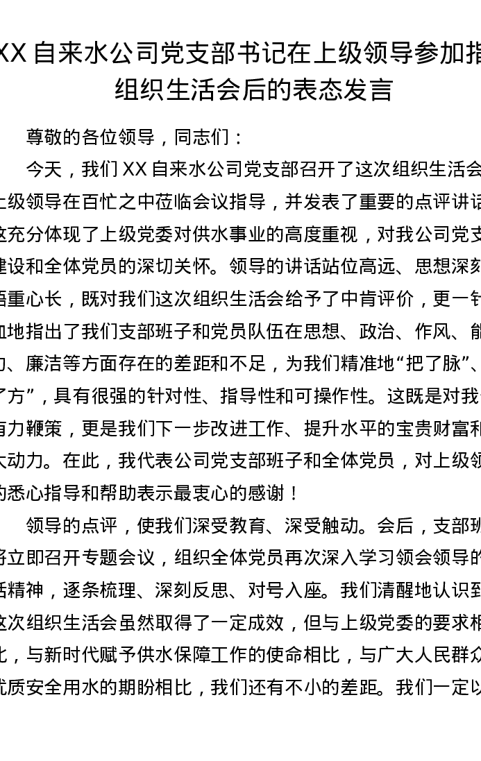 XX自来水公司党支部书记在上级领导参加指导组织xxx后的表态发言(2340字)
