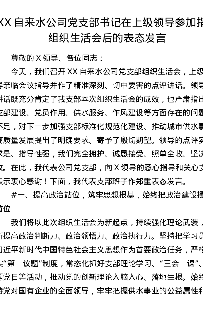 XX自来水公司党支部书记在上级领导参加指导组织xxx后的表态发言(2477字)