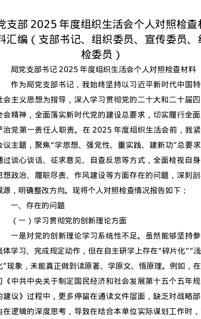 党支部2025年度组织xxx个人对照检查材料汇编(支部书记、组织委员、宣传委员、纪检委员)