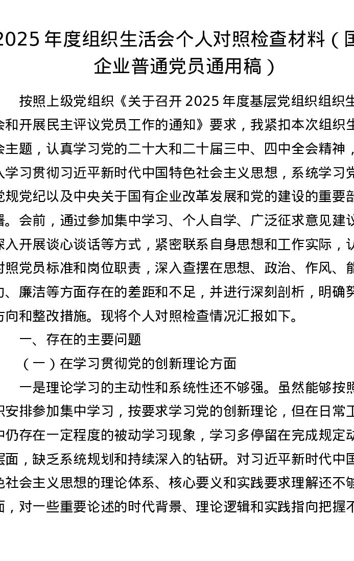 国企2025年度组织xxx个人对照检查材料