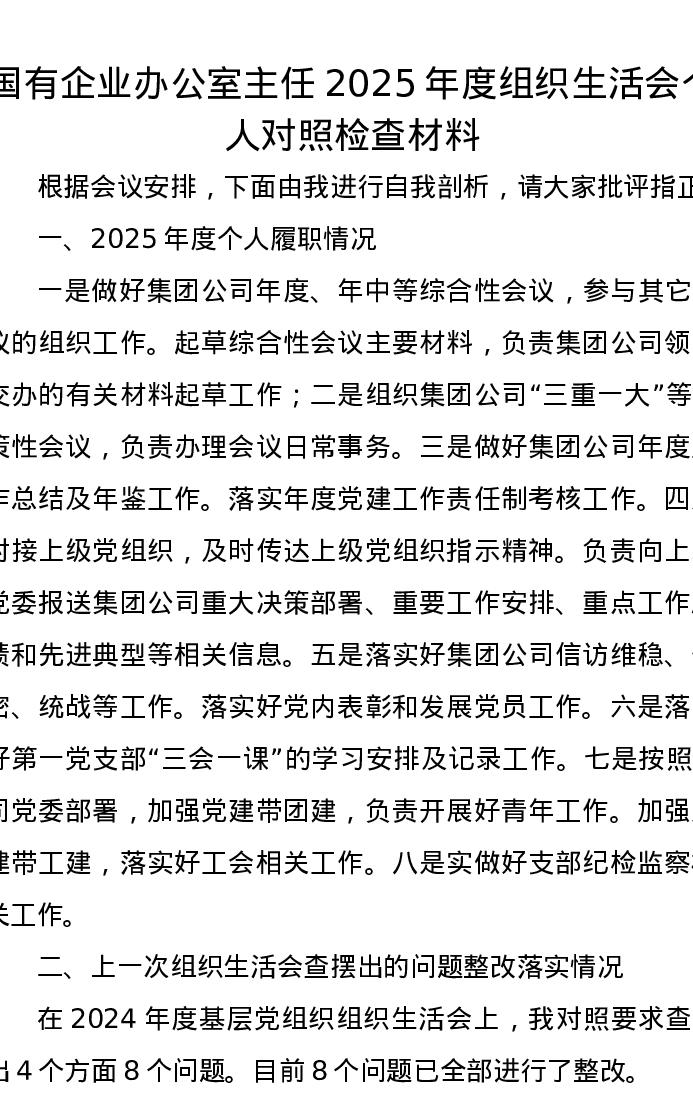 国有企业办公室主任2025年度组织xxx个人对照检查材料