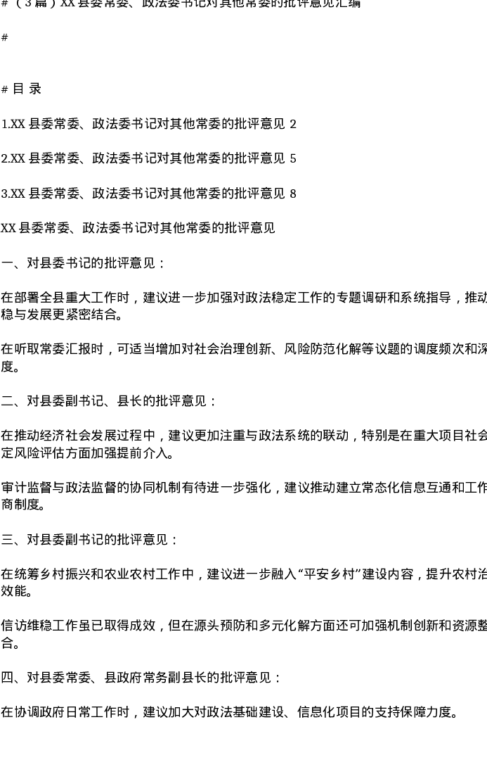 汇编:XX县委常委、政法委书记对其他常委的批评意见3篇