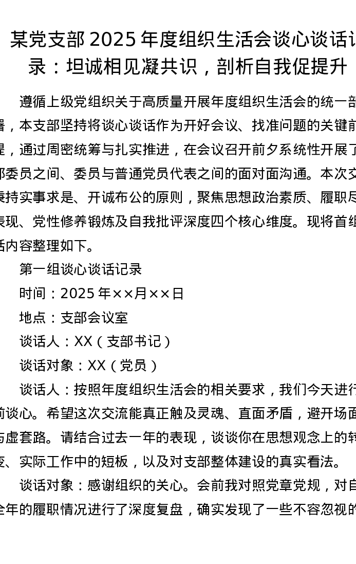 某党支部2025年度组织xxx谈心谈话记录:坦诚相见凝共识,剖析自我促提升