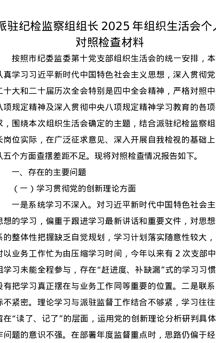 派驻纪检监察组组长2025年组织xxx个人对照检查材料