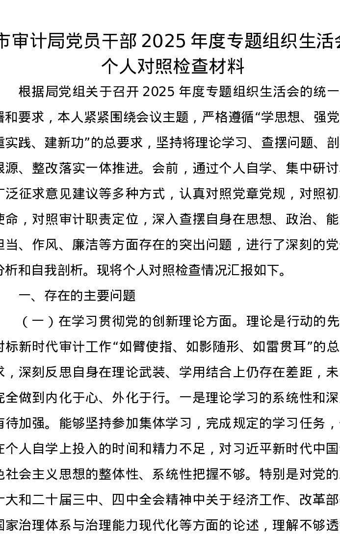 市审计局党员干部2025年度专题组织xxx个人对照检查材料