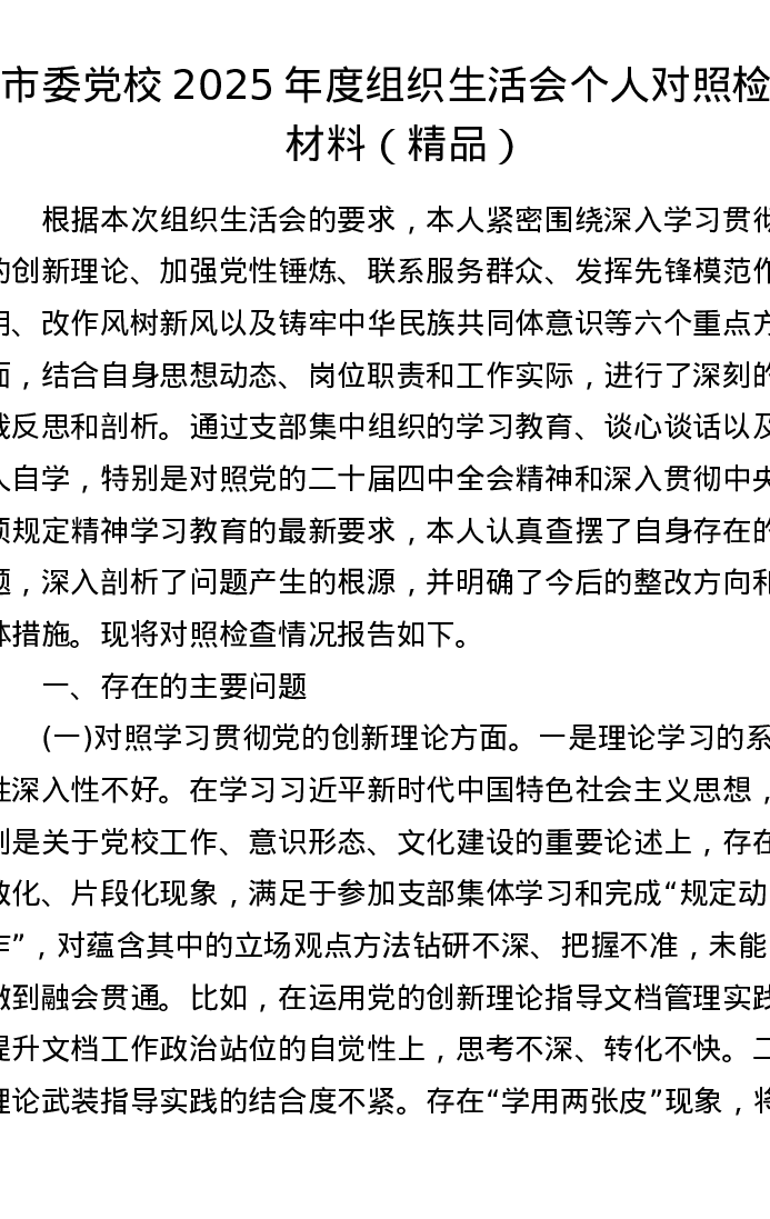 市委党校2025年度组织xxx个人对照检查材料
