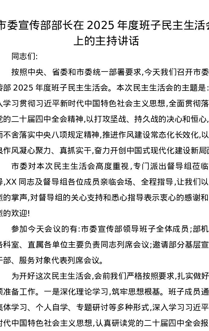 市委宣传部部长在2025年度班子xxxxx上的主持讲话