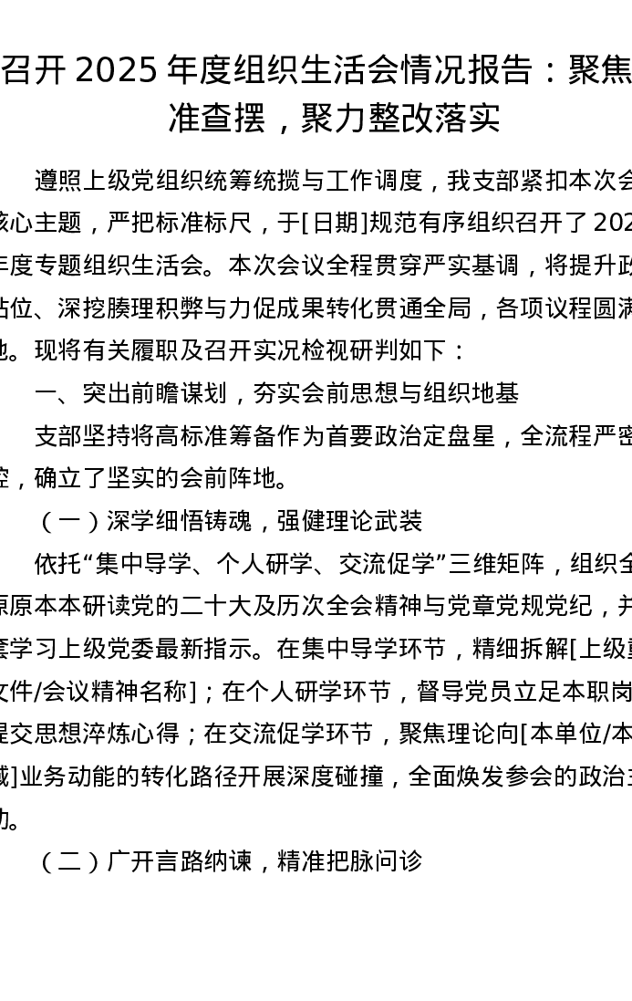 召开2025年度组织xxx情况报告:聚焦精准查摆,聚力整改落实