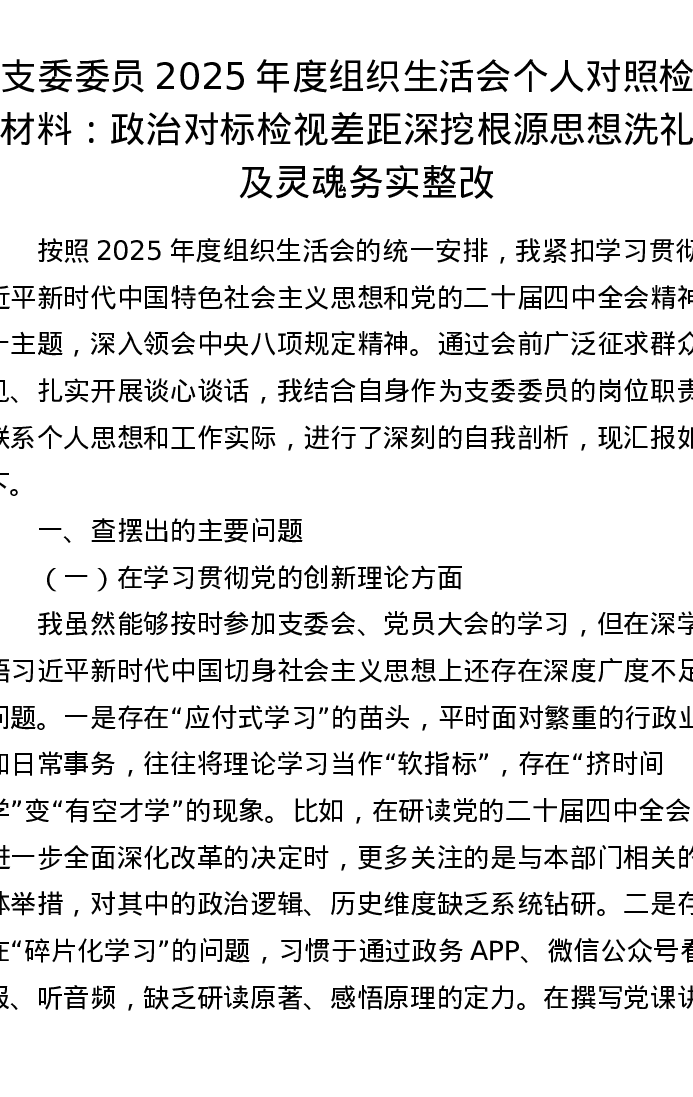 支委委员2025年度组织xxx个人对照检查材料:政治对标检视差距深挖根源 思想洗礼触及灵魂务实整改
