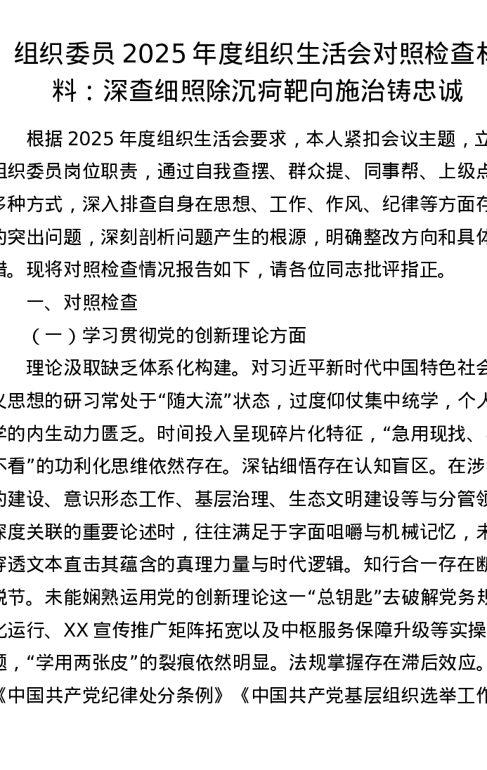 组织委员2025年度组织xxx对照检查材料:深查细照除沉疴 靶向施治铸忠诚