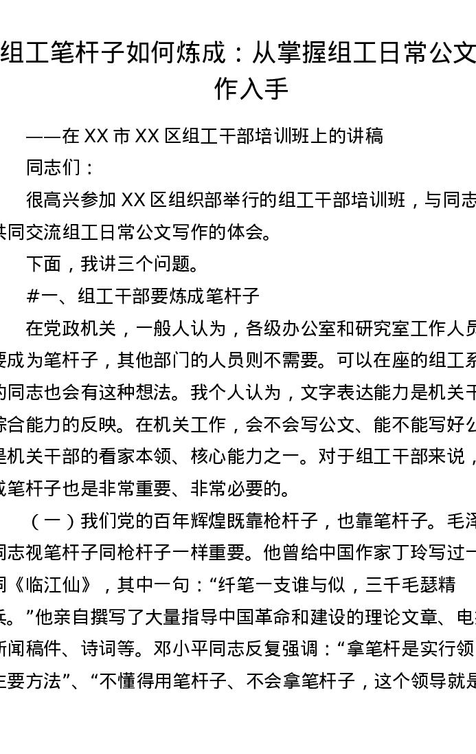 组工笔杆子如何炼成:从掌握组工日常公文写作入手——在XX市XX区组工干部培训班上的讲稿