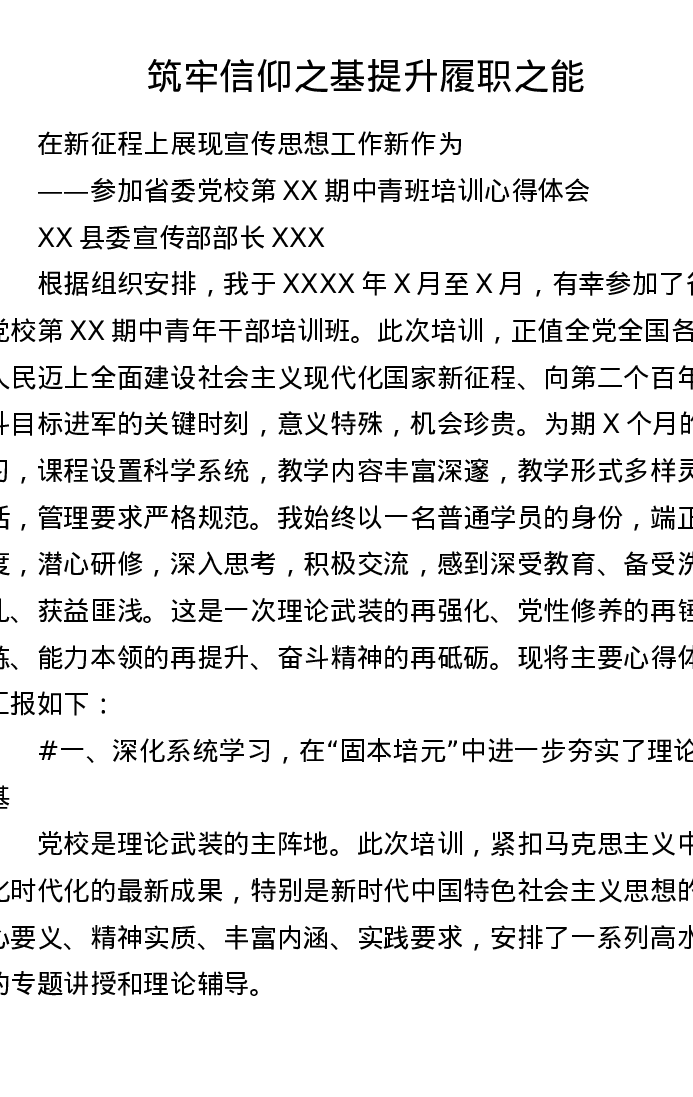 XX县委宣传部部长在省委党校中青班培训的心得体会(3951字)