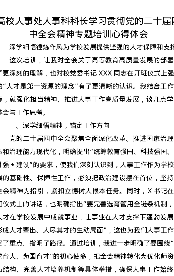 高校人事处人事科科长学习贯彻党的二十届四中全会精神专题培训心得体会
