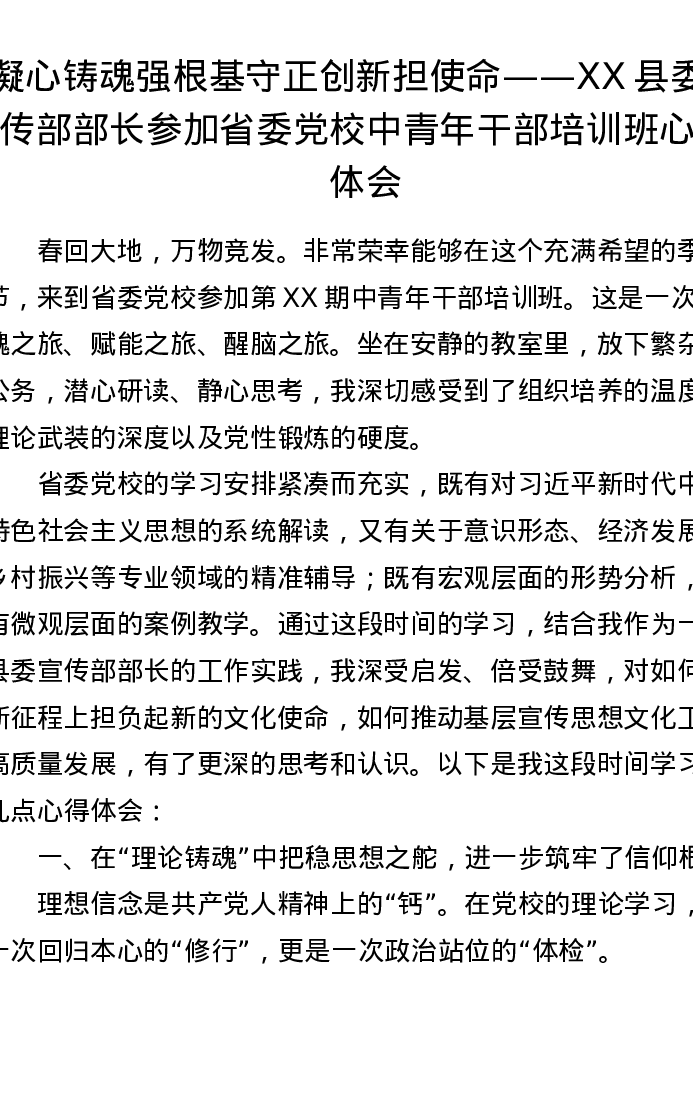 凝心铸魂强根基 守正创新担使命——XX县委宣传部部长参加省委党校中青年干部培训班心得体会