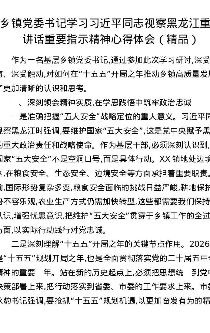 乡镇党委书记学习总书记视察黑龙江重要讲话重要指示精神心得体会