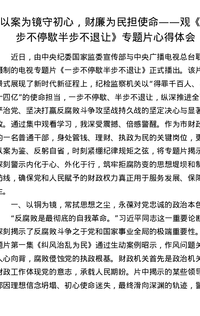 以案为镜守初心,财廉为民担使命——观《一步不停歇半步不退让》专题片心得体会