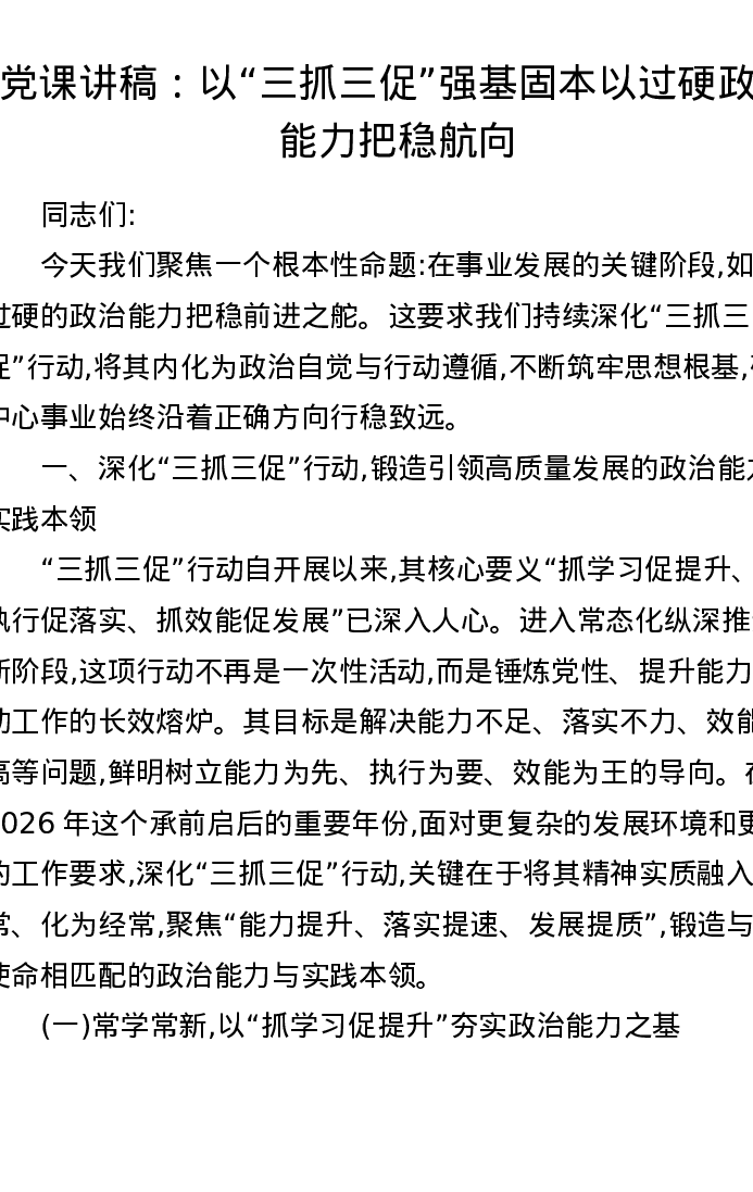 党课讲稿:以三抓三促强基固本以过硬政治能力把稳航向