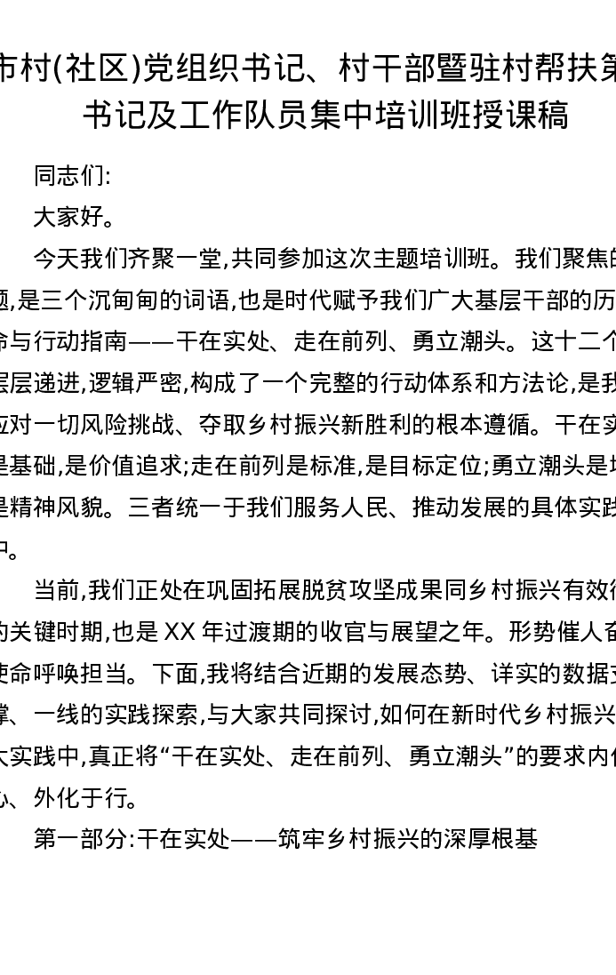 市村(社区)党组织书记、村干部暨驻村帮扶第一书记及工作队员集中培训班授课稿