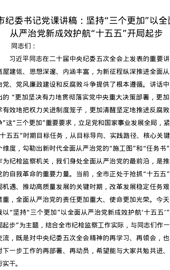 市纪委书记党课讲稿:坚持 三个更加 以全面从严治党新成效护航 十五五 开局起步