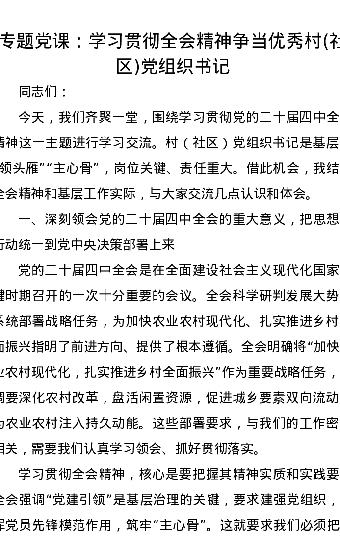 专题党课:学习贯彻全会精神 争当优秀村(社区)党组织书记