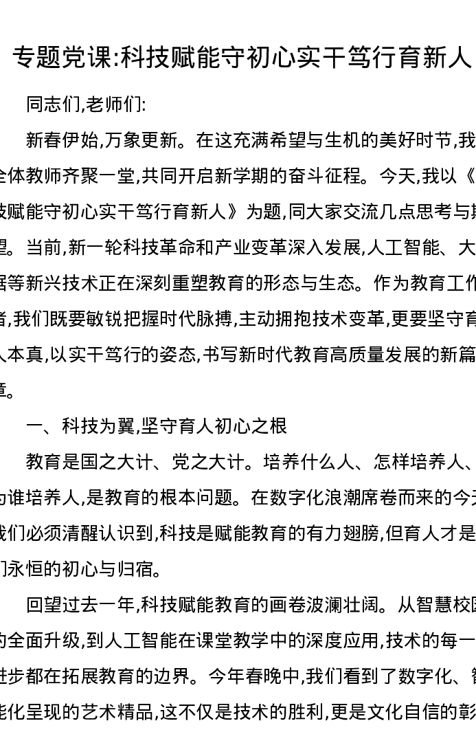 专题党课讲稿:科技赋能守初心实干笃行育新人