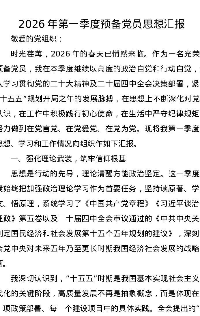 2026年第一季度预备党员思想汇报