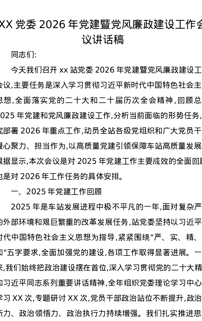 XX党委2026年党建暨党风廉政建设工作会议讲话稿