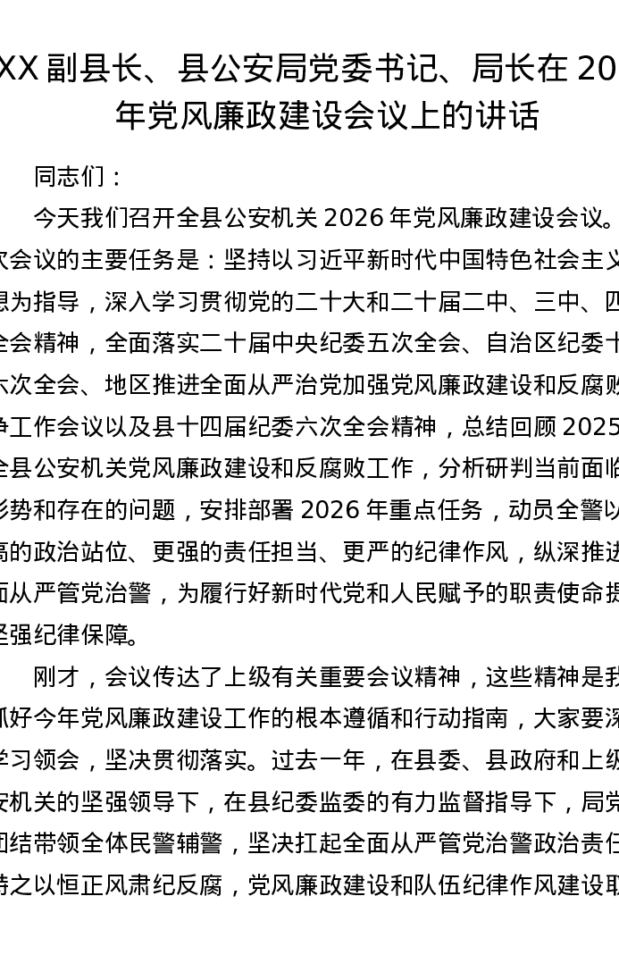 XX副县长、县公安局党委书记、局长在2026年党风廉政建设会议上的讲话(7017字)