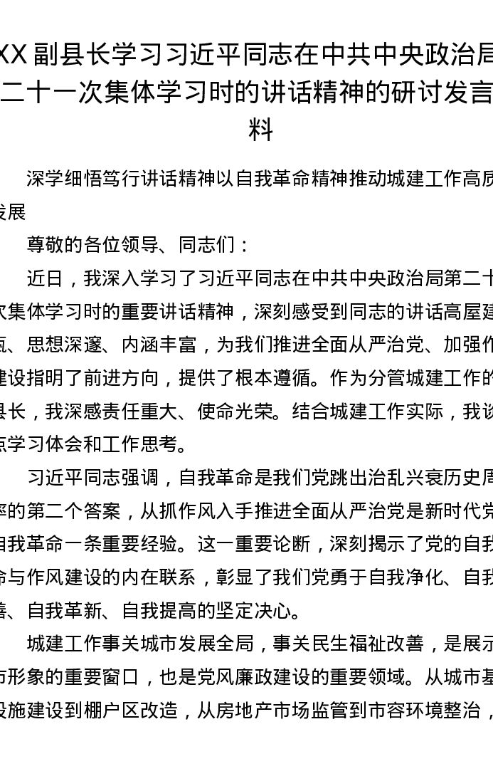 XX副县长学习总书记在中共中央政治局第二十一次集体学习时的讲话精神的研讨发言材料