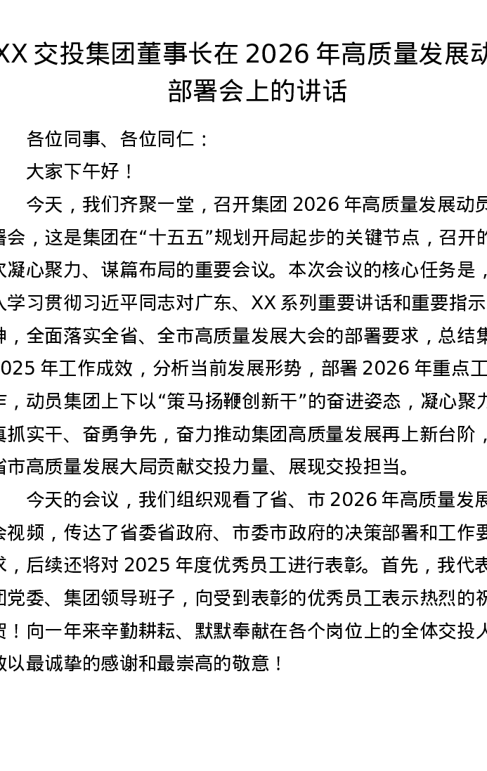 XX交投集团董事长在2026年高质量发展动员部署会上的讲话