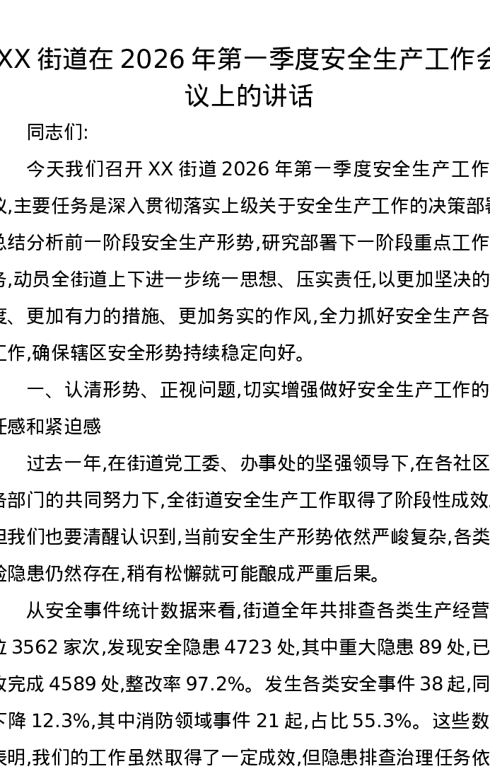 XX街道在2026年第一季度安全生产工作会议上的讲话