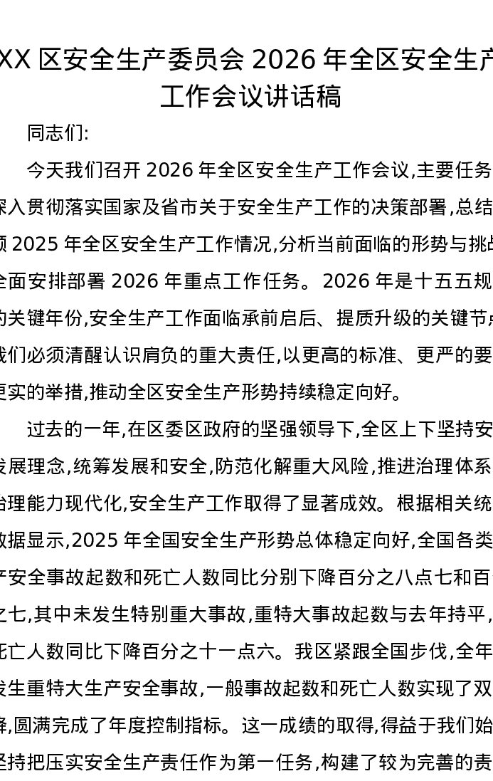 XX区安全生产委员会2026年全区安全生产工作会议讲话稿