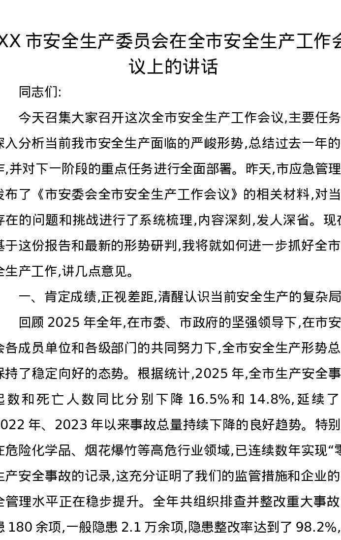 XX市安全生产委员会在全市安全生产工作会议上的讲话