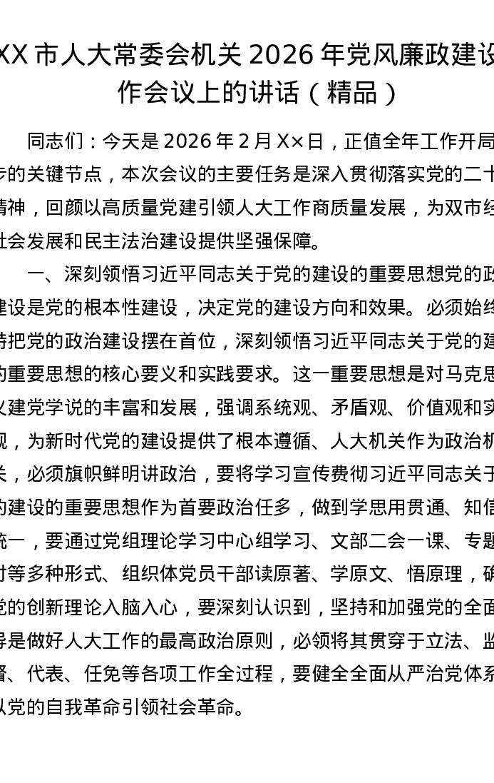 XX市人大常委会机关2026年党风廉政建设工作会议上的讲话