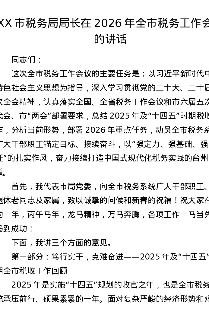 XX市税务局局长在2026年全市税务工作会上的讲话